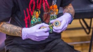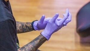 - Gloves: Disposable gloves must be worn by tattoo artists throughout the entire tattoo process. Gloves should be changed if they become contaminated, such as after touching non-sterile surfaces.
